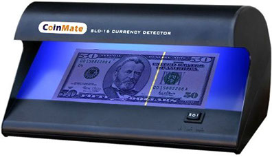 Lámpara detectora de billetes falsos. A través de sus tubos de luz ultravioleta y blanca, reflejan las marcas de seguridad de billetes e inclusive vales de despensa, facturas o tarjetas de crédito. Además, tiene un detector de banda magnética, garantizando que cualquier billete o documento que se recibe sea auténtico.
